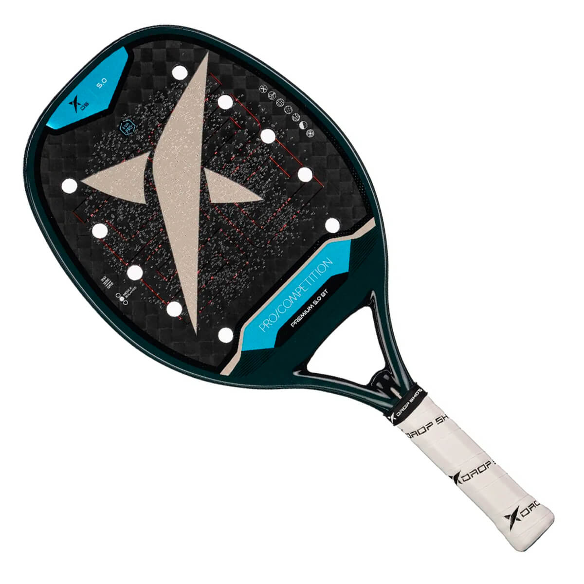 A Raquete de Beach Tennis DROP SHOT Premium 5.0 BT é um modelo desenvolvido para proporcionar precisão, potência e máximo desempenho em todas as jogadas. Construída com Carbono 12K Bidirecional e tecnologia Textreme, essa raquete combina leveza e resistência, oferecendo um equilíbrio perfeito entre potência e controle. Seu núcleo em EVA PRO confere maior firmeza na batida, garantindo respostas explosivas e excelente absorção de impacto.Para potencializar a performance, a raquete conta com a tecnologia SPIN Coating, que aprimora o efeito na bola e melhora o controle. O Ergo Pro Protector protege a estrutura contra impactos e desgastes, aumentando a durabilidade. O Power Beam Heart reforça a rigidez da raquete, proporcionando maior estabilidade nos golpes.O Vibra Tech reduz vibrações, trazendo mais conforto e minimizando riscos de lesões. Além disso, o Cork Cushion Grip melhora a pegada, garantindo mais precisão e segurança. Com o Twin Tubular System, a estrutura da raquete ganha mais resistência e longevidade. Já o Smart Hole System e o Expand Hole System otimizam a distribuição dos furos, aumentando a aerodinâmica e proporcionando maior precisão nos golpes.