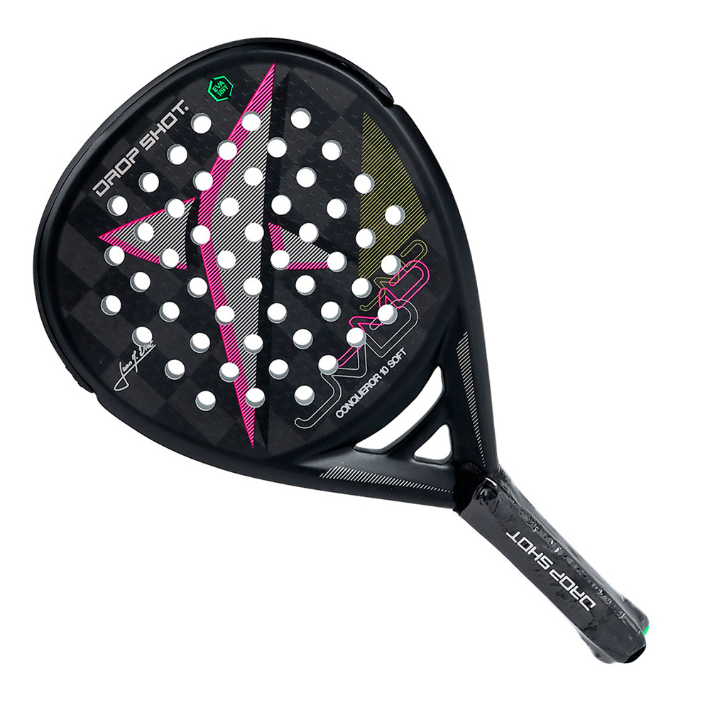 Como não poderia ser de outra forma, o novo Drop Shot Conqueror 10 Soft ocupa o centro das atençõ;es no topo. E é que dentro das linhas Be One e JMD Series, a versão mais confortável e macia da raquete de Juan Martín Díaz é uma referência clara para jogadores que procuram mais saída de bola e jogadores que precisam do melhor material. Um Drop Shot Conqueror 10 Soft que fica ótimo dentro e fora da quadra. Com um formato de lágrima, um sweet spot notável para otimizar a zona de rebatida, equilíbrio médio-alto e deslocamento extra na zona ofensiva, esta raquete continua a ser uma referência na nossa coleção pelo seu dinamismo e potência. Uma Drop Shot Conqueror 10 Soft que compartilha recursos com o Drop Shot Conqueror 10, mas com variaçõ;es. As faces Rectangle Carbon 24K combinadas com as tecnologias CURV 360 e 3D Face são adicionadas ao quadro de carbono tubular duplo, para dar lugar a um núcleo Eva Soft de baixa densidade e leve que permite que o sistema de impacto evolua, melhore a sensação no impacto e obtenha alta jogabilidade. Power Beam Heart, Smart Holes System, Ergo Pro Protector, Silicone Grip Channel e Cork Cushion Grip são as restantes tecnologias que fazem deste Drop Shot Conqueror 10 Soft uma clara referência de vanguarda. Um modelo que evolui esteticamente para este 2022 e o faz dando destaque ao Triaxial Carbon em suas faces e jogando com prata iridescente, preto e magenta para obter um produto cuidadoso, detalhado e de grande apelo visual. Uma Drop Shot Conqueror 10 Soft que é a resposta perfeita para os amantes do controle que procuram potência extra e uma alta sensação de batida em qualquer circunstância.