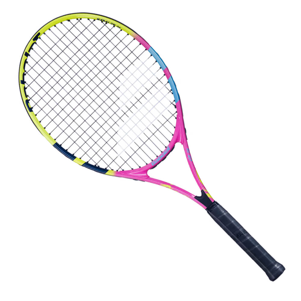 A raquete Nadal Junior 26 é mais leve, mais maneável e mais tolerante, o que facilita a aprendizagem do ténis e permite progredir rapidamente enquanto se diverte em campo. O seu filho(a) terá orgulho em ir para o campo com uma raquete com as cores do Rafa. A raquete Nadal Junior 26 é adequada para jovens jogadores, com altura entre 145 e 155 cm. Produzida em alumínio é leve e dotada de uma rede maior, com um grip de tamanho mais adaptado à morfologia das crianças para que a aprendizagem do tênis seja mais fácil e lúdica. Graças ao padrão das cordas mais aberto e a uma rede maior, a Nadal Junior 26 facilita a geração de potência para ajudar a criança a obter mais comprimento de bola.